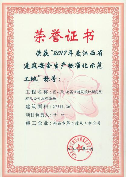 公司承建的郭家莊地塊棚戶區(qū)改造項(xiàng)目(安置房)工程、匠人聚.南昌市建筑設(shè)計(jì)研究院有限公司總部基地榮獲2017年度江西省建筑安全生產(chǎn)標(biāo)準(zhǔn)化示范工地稱號。