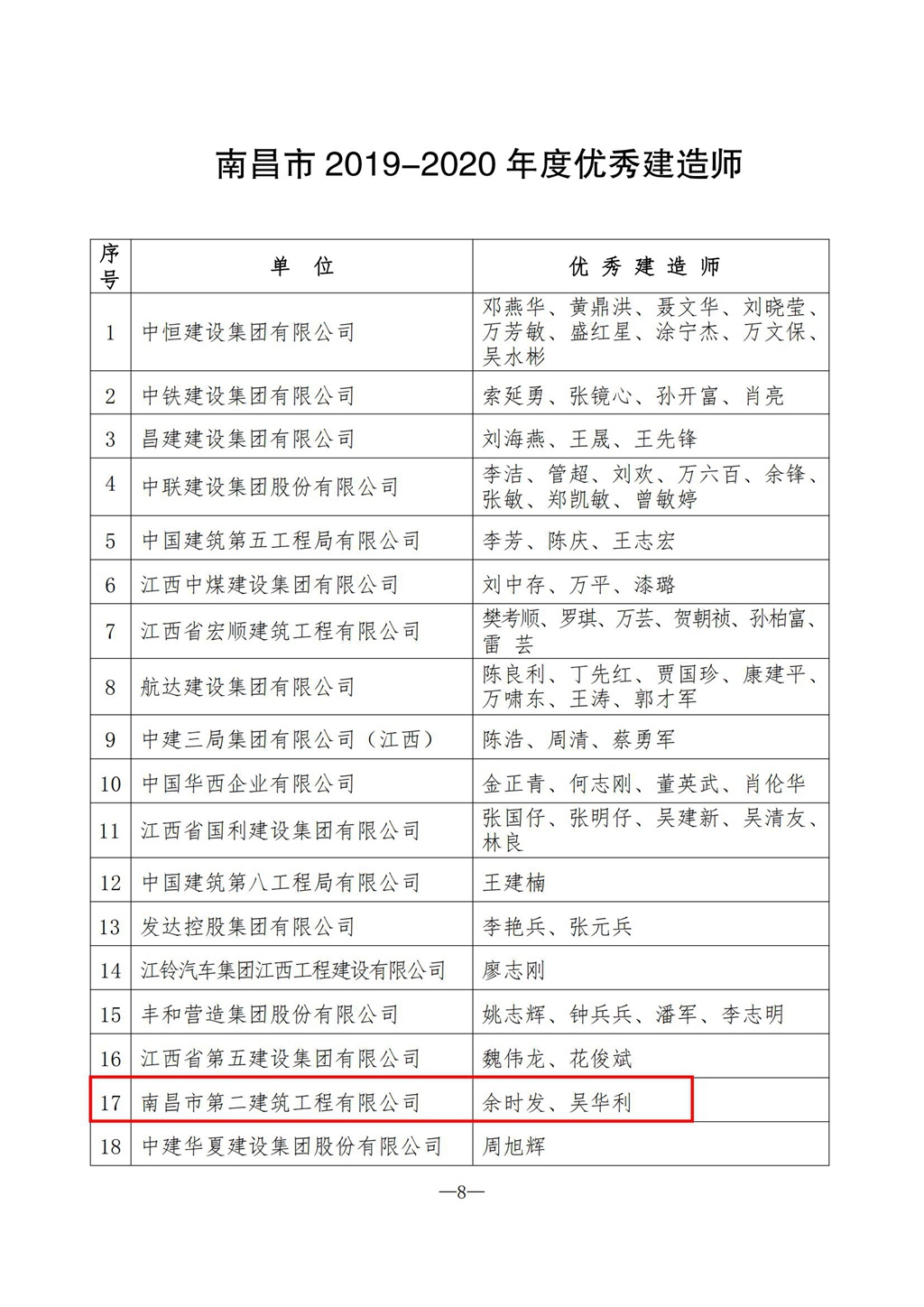 為表彰先進(jìn)、樹立典型,鼓勵(lì)建筑業(yè)做大做強(qiáng),著力推動(dòng)我市建筑業(yè)快速健康發(fā)展,南昌市建筑業(yè)協(xié)會(huì)開展全市 2019—2020 年度南昌市建筑業(yè)先進(jìn)企業(yè)和優(yōu)秀建造師(監(jiān)理師)評(píng)選活動(dòng)。經(jīng)企業(yè)申報(bào)、市建協(xié)評(píng)審、綜合市建設(shè)局相關(guān)職能部門意見,共有 82 個(gè)單位被評(píng)為南昌市建筑業(yè)先進(jìn)企業(yè) ,151 名建造師被評(píng)為南昌市建筑業(yè)優(yōu)秀建造師,其中,我公司再次獲評(píng)市“先進(jìn)企業(yè)”、余時(shí)發(fā)和吳華利被評(píng)為市“優(yōu)秀建造師”稱號(hào),并受到表彰。